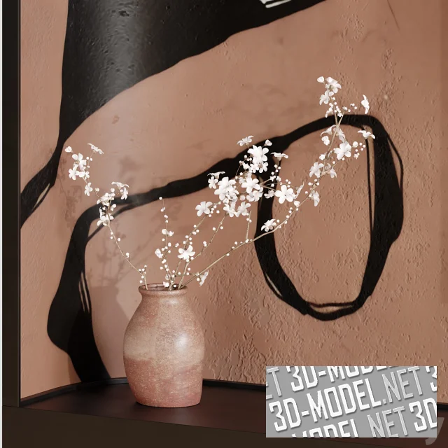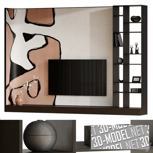 Современная телевизионная панель Sony KD65X81JR, с длинным темно-коричневым подиумом под ней, полками, абстрактным декоративным панно на стене, аксессуарами и декором. Левый край стены, скругляясь поворачивает небольшой частью внутрь пространства, делая левый край столешницы тумбы тоже скругленным, повторяющим изгиб стены. Роспись по декоративной штукатурке выполнена в виде криволинейных пятен и контуров в сочетании белого, терракотового и черного. Стеллаж с полками занимает правую часть композиции. На полках и подиуме: терракотовая ваза с цветущими ветками, черно-серые абстрактные статуэтки и вазы, черные подсвечники, книги в черных обложках, черная фоторамка.