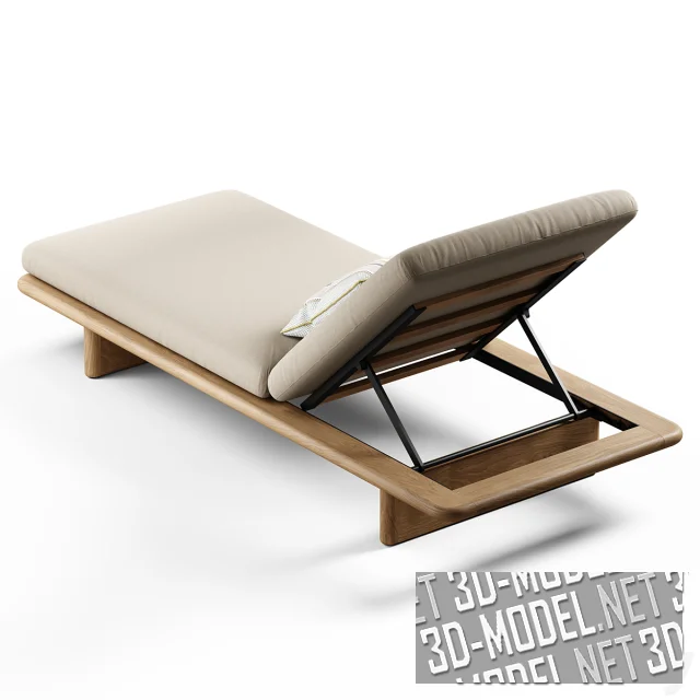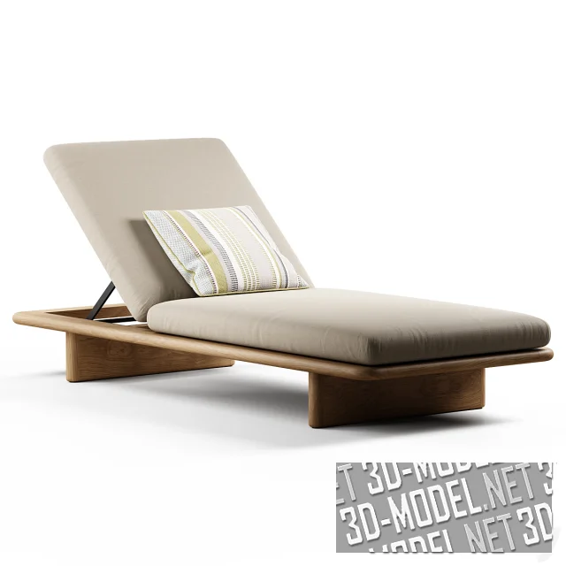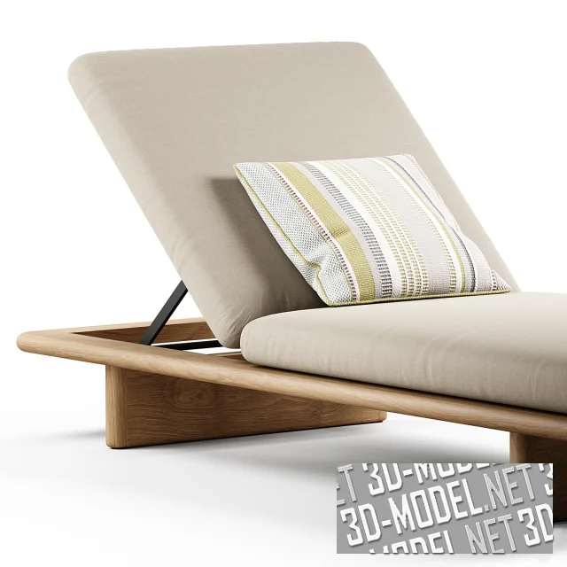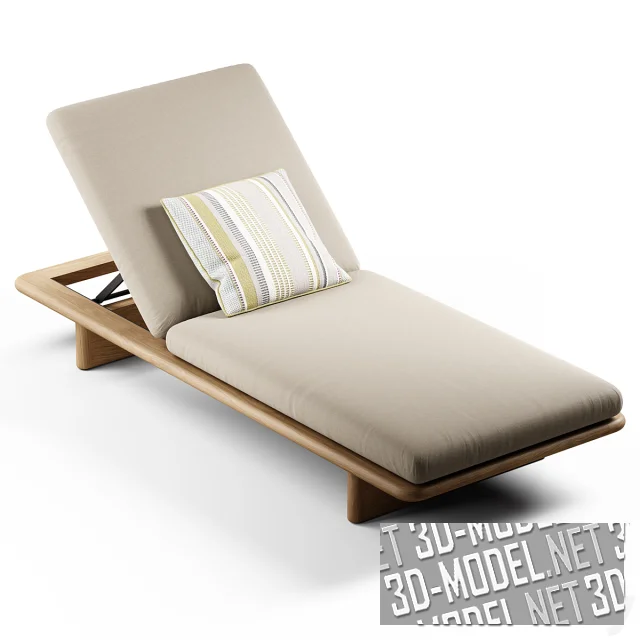 Современный шезлонг Deckchair из коллекции Mesh от Kettal. Шезлонг на гладкой деревянной раме с двумя опорами, с мягкими матрасами и регулировкой угла наклона спинки. Габарит изделия: h17(без матраса), h23,5см (с матрасом), h77см (с поднятой на максимум подголовной секцией), длина - 203см, ширина 85см. Поперечные деревянные опоры и рама под сатиновым прозрачным лаком, с красивой текстурой дерева. Чехлы матрасов серовато-бежевые, светлые. Шезлонг дополняет небольшая квадратная подушка с полосками и пунктирами в серо-салатовых тонах.