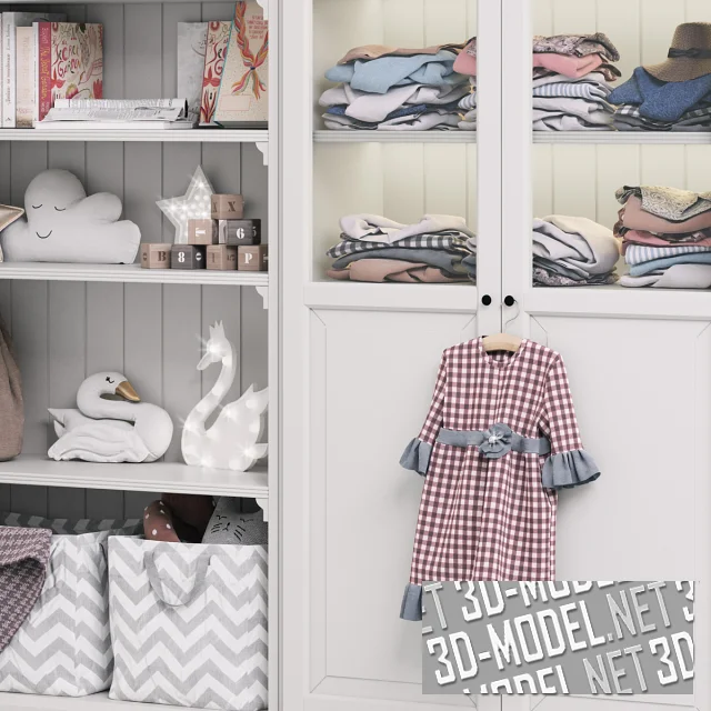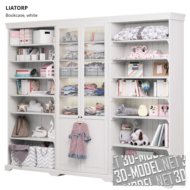 Белый трехсекционный шкаф LIATORP от Ikea, в стиле Прованс, с открытыми полками по бокам и двумя створками со стеклянными вставками. Задняя стена набрана вертикальными планками. В центральной секции со створками обустроены полки со скрытой подсветкой. На полках: подушки, прямоугольные текстильные коробки, детская одежда, игрушки, книги, канцтовары, текстильный мешок, плед. На ручке центральной створки висит клетчатое детское платье на деревянных плечиках.
