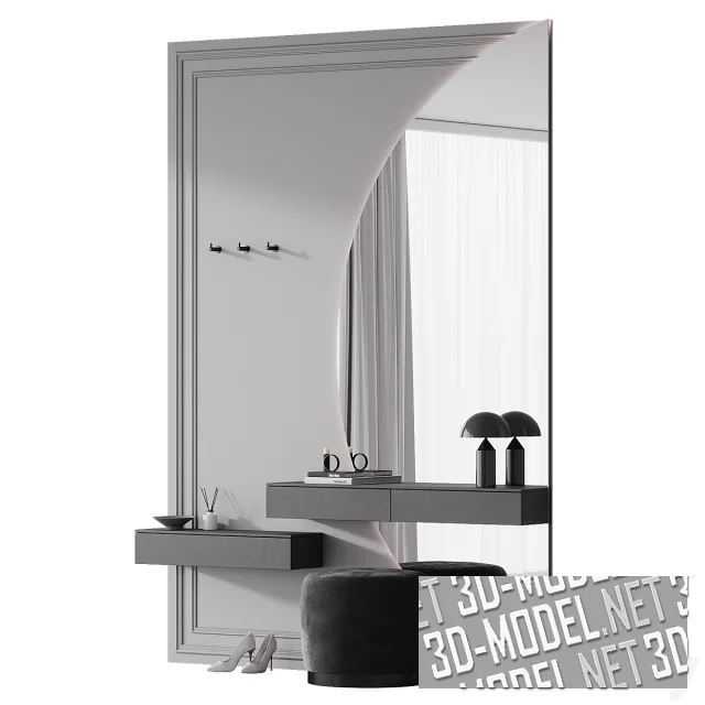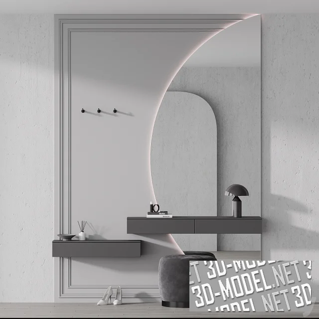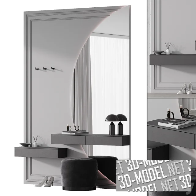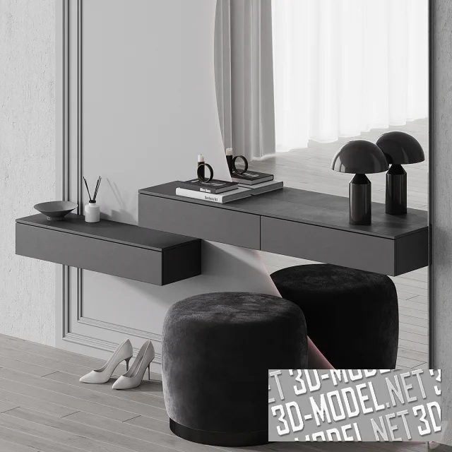 В нижнем уровне на панели, на разной высоте, подвешены два темно-серых консольных столика (с одним и двумя выдвижными ящиками с фасадами без ручек). На полу круглый пуф с темно-серой велюровой обивкой на черном цоколе. Сцену дополняют предметы на столах: черный минималистичный настольный светильник с полусферой рефлектора; черный подсвечник; пара книг; аромо-диффузор с черными палочками в белом флаконе, серая тарелка. На полу пара белых женских туфель на высоком каблуке.