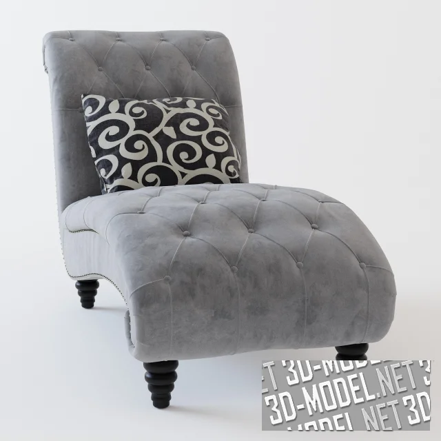 Элегантный классический серый шезлонг Natalia от House of Hampton (Арт.: HOHN2244). Плоскость сиденья и спинки декорирована пуговками-втяжками и простежкой капитоне. Короткие стороны в изножье и изголовье изящно «подвернуты» в подобие свитков. По боковым плоскостям корпуса швы пробиты рядами серебристых мебельных гвоздиков. Небольшие точеные деревянные ножки выкрашены в черный цвет. Шезлонг дополнен квадратной подушкой в чехле с черно-белым орнаментом в стиле арт-деко.