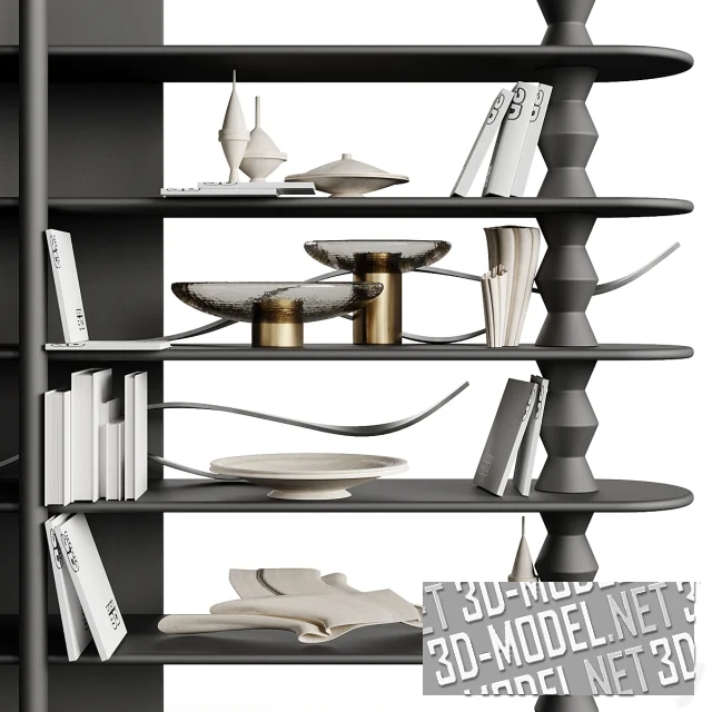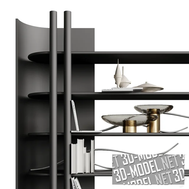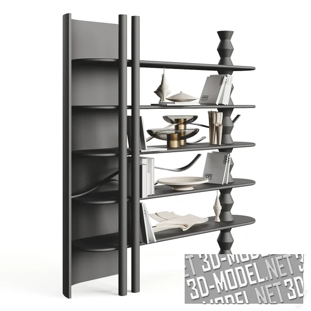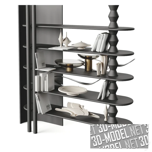 Современный асимметричный стеллаж ALLY от Ana Roque, с пятью скругленными полками для книг и декора. Конструкция опор несет основную декоративную нагрузку. Дальняя левая опора выполнена из вертикального листа МДФ, согнутого и огибающего скругления полок. Пара передних левых опор выполнена в виде стоек круглого сечения, примыкающих к передней кромке полок. Справа полки опираются на стойку, пересекающую все полки, разделяя их выточенными «конфетообразными» элементами. Габарит стеллажа: 190х48х195см.