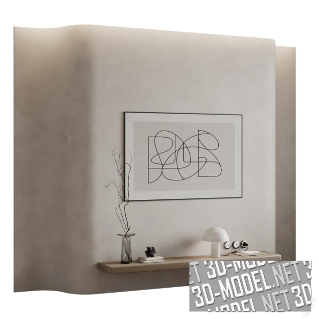 Фрагмент минималистичной современной гостиной в стиле ваби-саби для обустройства ТВ-зоны. Композиция выстраивается в центре криволинейной стены с рустикальной декоративной штукатуркой в оттенках слоновой кости. На стене смонтирована низкая деревянная полка и горизонтальное прямоугольное панно в тонкой черной раме с абстрактным черным контурным изображением на фоне в оттенках слоновой кости. На месте панно легко представить современную ТВ-панель с заставкой на экране. На полке под панно разместились книги, белый настольный светильник с полусферой рефлектора, стеклянная ваза с завитками сухих веток, каменное темное пресс-папье в виде абстрактной геометрической фигуры. Над полкой в стене смонтированы три розетки (две сетевые и одна для ТВ-кабеля).