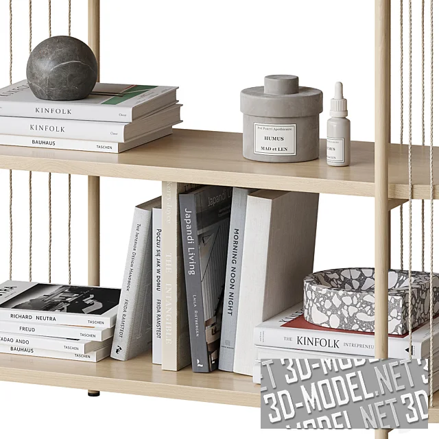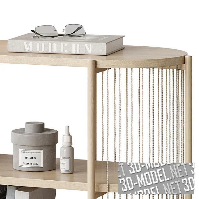 Трехуровневый деревянный стеллаж Thread от divan.ru, декорированный толстыми белыми шнурами. Нитки сконцентрированы на скругленных боках и заполняют условные плоскости между тремя ножками справа и тремя ножками слева. Габарит Thread rack: 124х42х80см. На полках книги, настольный светильник с каменной опорой и белым тканевым абажуром, каменная пепельница, очки, аромосвеча и аромомасло HUMUS.