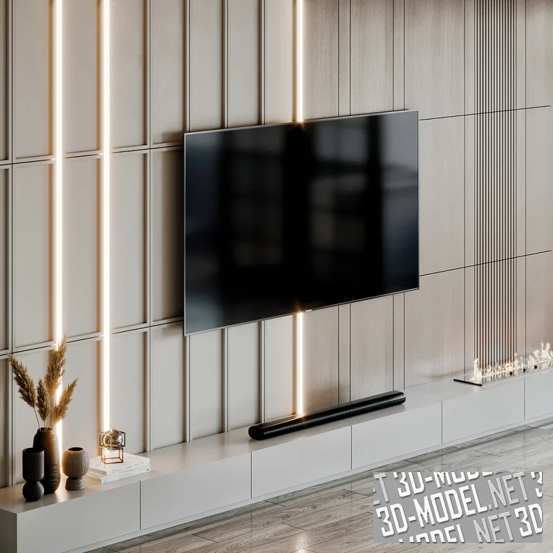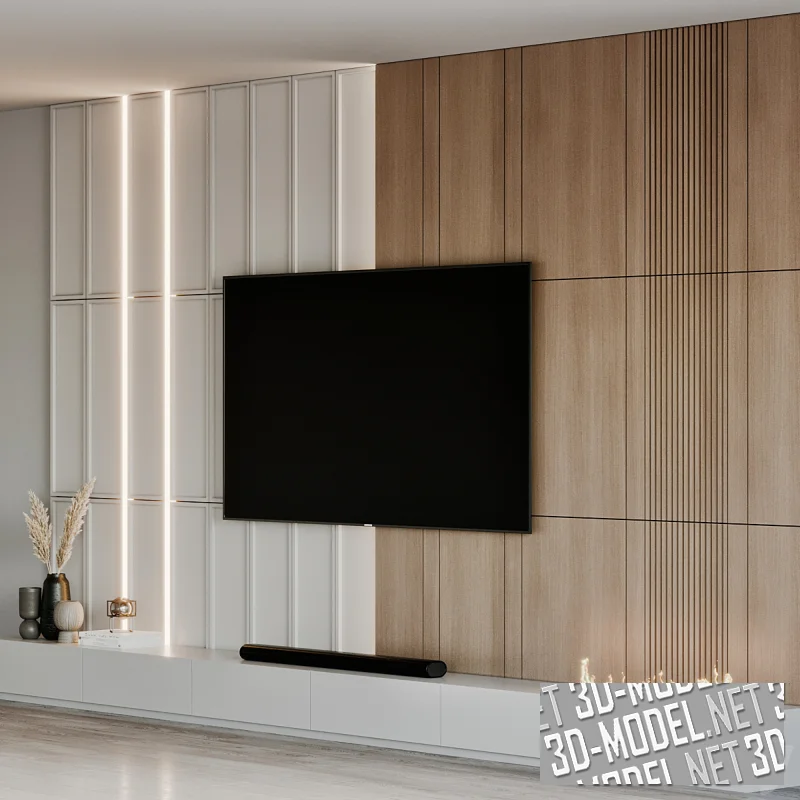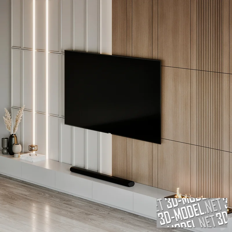 Интерьерный модуль для гостиной, выполненный в минималистичном стиле с акцентом на геометрию и свет. Центральным элементом композиции является настенная панель с крупным экраном, встроенным в систему вертикальных и горизонтальных линий. Сочетание светлых матовых поверхностей и панелей с древесной текстурой создает спокойный, уравновешенный фон, который выглядит аккуратно и визуально структурировано.