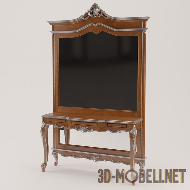 3d модель зеркала с консольным столиком от итальянского производителя Modenese Gastone. Артикул – 12604, коллекция Casanova. Размеры: L. 151 P. 46 H. 230. Итальянское зеркало в резной раме, с небольшим консольным столиком. И рама с ножками, и столик, украшены замысловатой инкрустацией из серебристого металла. Великолепно будет смотреться в интерьере спальни, выполненном в классическом стиле.