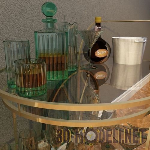 3d модель барной декоративной тележки бронзового цвета, с двумя большими колесами со спицами. На тележке предусмотрены две плоскости. На верхней, с прикрепленной ручкой и бронзовым двойным бортиком, стоят различные крепкие напитки, в бутылках и зеленом рифленом графине с пробкой. На нижней полке находится множество разных прозрачных бокалов. Модель с текстурами.