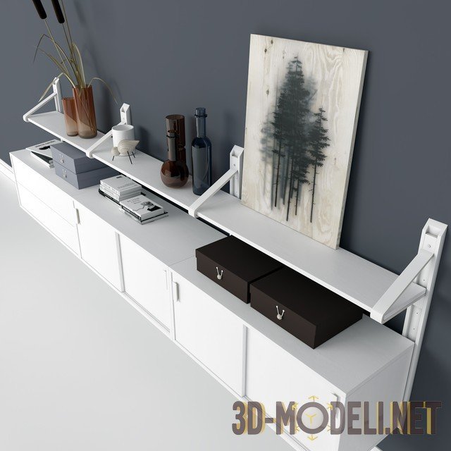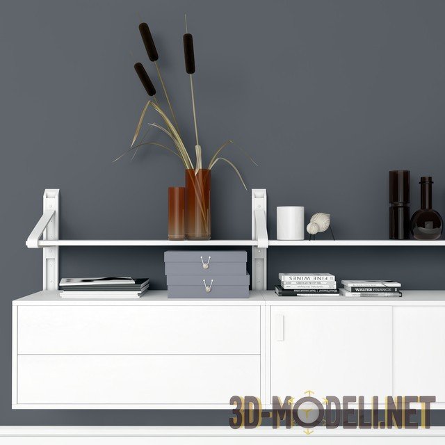 3d модель современной модульной мебели Nurmela Link, представленной с разнообразным декором: это полки, картины, камыш в вазе и пр. Ширина одной секции мебели составляет 900 мм. Формат модели: 3ds max 2014, fbx, материалы Vray