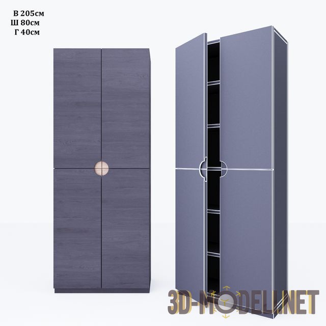 Современный четырёхстворчатый шкаф с полками, в стиле минимализм. Фасады и корпус шкафа выполнены из дерева. Тонированы в приглушенный фиолетово–синий. Ручка выполнена в виде круглого элемента, фрезерованного на перекрестии межфасадных щелей. Дно круга тонировано в светлое дерево. Внутри шкафа помещены шесть полок.