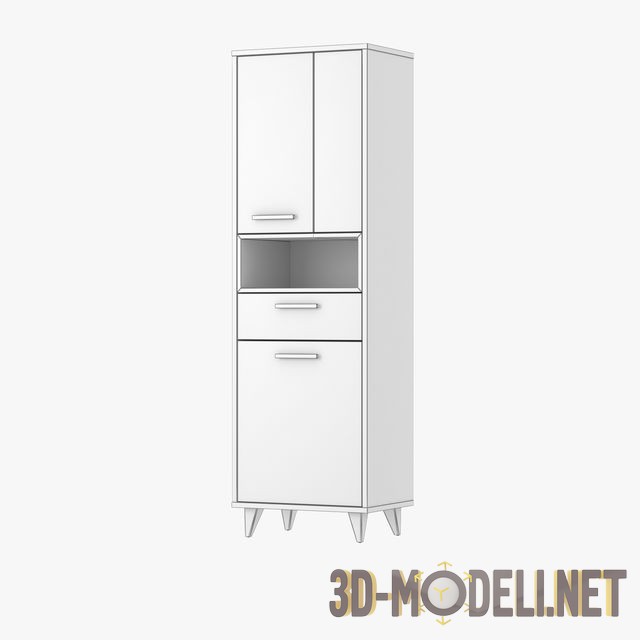 Современная секция шкафа, Rack Brandon 41351 от Homster. Корпус выполнен из плиты под тёмный орех. Нижняя створка с чёрной матовой поверхностью. Верхняя створка комбинированная: серебристо–серая с зеркальной вставкой. В центральной части оборудованы две небольшие сине–зелёные ячейки: открытая и с выдвижным ящиком. Шкаф стоит на небольших треугольных ножках чёрного цвета.