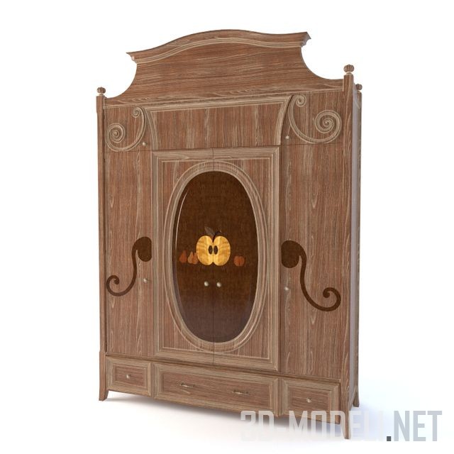 Декоративный платяной «Фруктовый» шкаф от дизайнера Е.П.Илатовского. Передняя плоскость представлена в двух вариантах отделки шпоном – беленый и темно–коричневый. Центральные створки украшает маркетри в виде яблок, груш, завитков, а также резные молдинги и накладки.