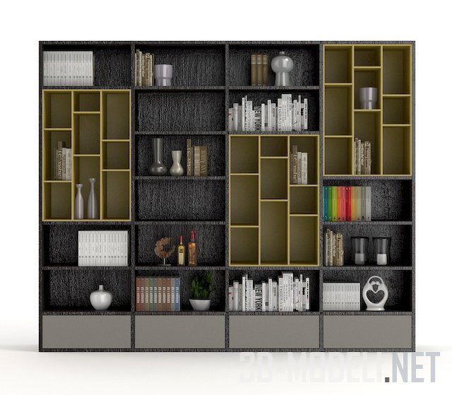 Подборка из четырех 3D-моделей (групп) современных шкафов для интерьера. Каждый шкаф имеет свое наполнение книгами и декором, что очень удобно и позволяет быстро оформить ваш интерьер - просто выберите мебель по вкусу. Текстуры, материалы - все есть.