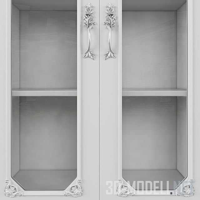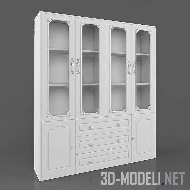 Очень красивый большой деревянный шкаф в классическом стиле, белого цвета. Верхняя часть имеет стеклянные дверцы, через которые просматриваются полки. Нижние ящики украшены белой резной инкрустацией.