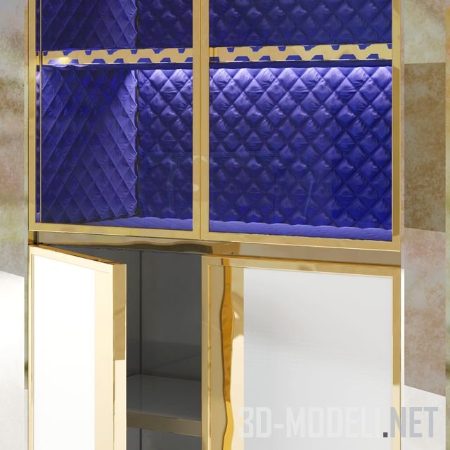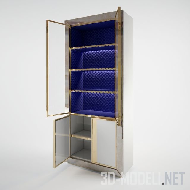 Витрина с глухими нижними дверцами белого цвета и стеклянными верхними, за которыми просматриваются синие, простеганные ромбами внутренние стенки и подсвеченные полки. Размеры витрины: L-120 см, W-45 см, H-220 см.