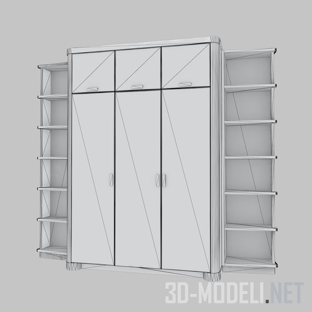 Большой красивый шкаф «Canto Modern Leather» от Art Way, с фасадами из натуральной кожи светло-бежевого цвета, зеркалом посередине, двумя узкими коричневыми открытыми стеллажами по бокам. Общий размер композиции составляет: 2866 х 608 х 2460 мм, размер собственно шкафа: 1716 х 608 х 2460 мм, размер стеллажа: 575 х 300 х 2400 мм.