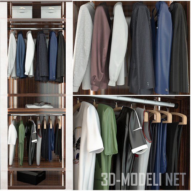 Современный гардеробный шкаф, модель Venere Capital collection. Показан сегмент А с мужской одеждой (футболки, брюки, пиджаки). Материалы и текстуры в архиве.