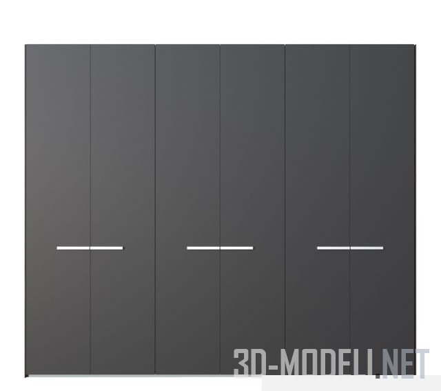 Очень стильный и современный многостворчатый шкаф от итальянского бренда Poliform, серия NEW ENTRY. Шкаф с матовыми фасадами графитового цвета и длинными металлическими поперечными ручками. Показан полностью закрытый шкаф и с открытой крайней дверцей, за которой просматриваются вещи.