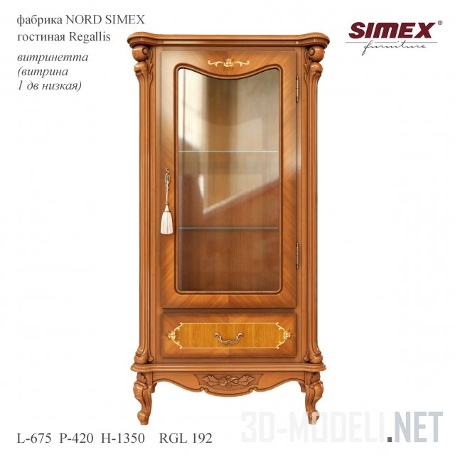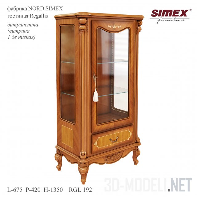 Витрина для гостиной Regallis (RGL 192) производства румынской мебельной фабрики Nord Simex (Vitrinetta). Цвет - орех и шпон из ценных пород дерева. Размеры 675 х 420 х 1350. Витрина отлично подойдет для интерьера в классическом стиле.