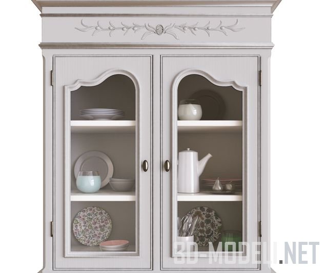 Деревянный буфет белого цвета в стиле прованс, модель LN01-LN02. За застекленными дверцами на полках стоят тарелки, кофейник и другая посуда (весь декор Zara Home). Размер буфета: ширина 101 х глубина 48 х высота 217 см. Такой буфет будет хорошо смотреться в интерьере кухни, проектируемой в стиле прованс.