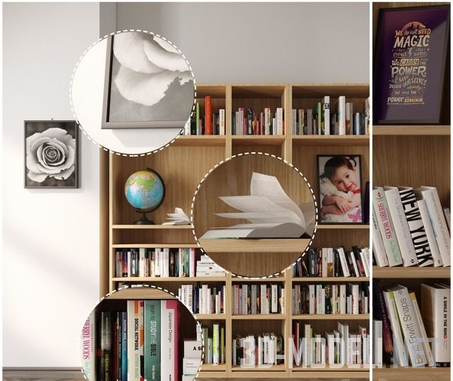 Классический книжный стеллаж в прямом понимании этого слова из светлого дерева. Открытые полки заставлены множеством книг. На одной из полок стоит глобус и небольшие часы.