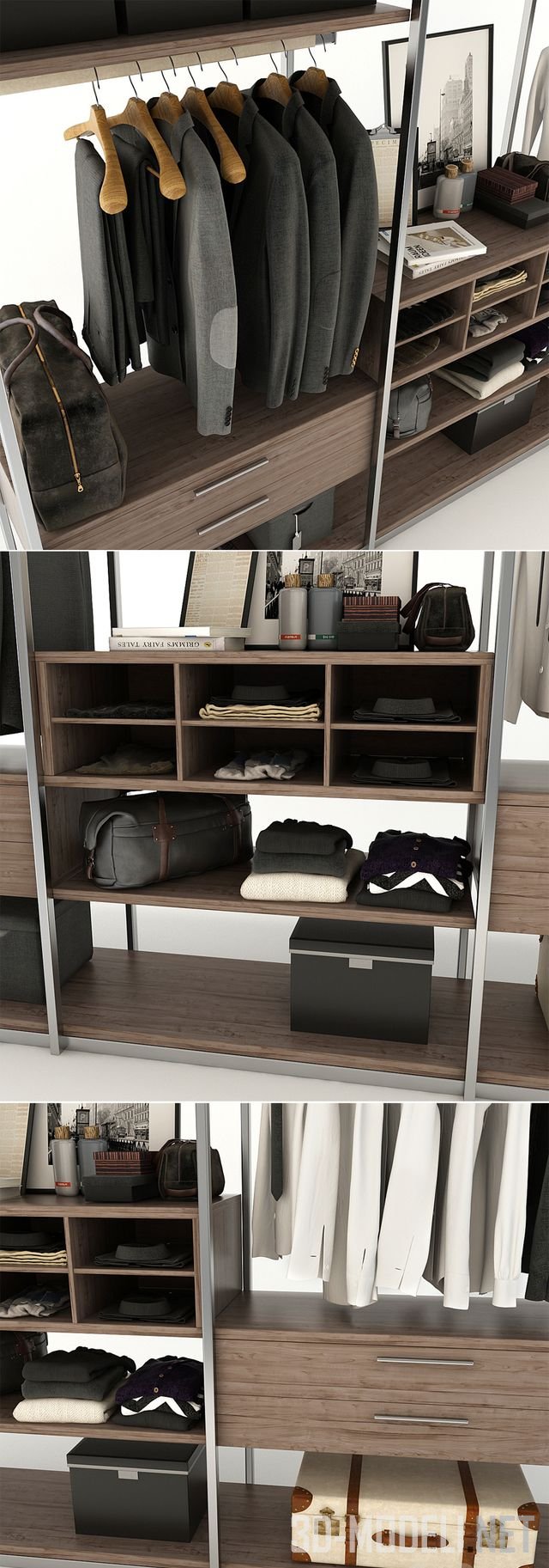 Удобный, вместительный шкаф с большим количеством вешалок, выдвижных полок и ящиков. Отличный вариант для создания гардеробной зоны. Преобладание текстуры дерева (шкаф, вешалки) делает мебель солидной и элегантной.