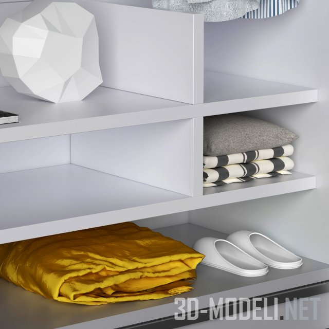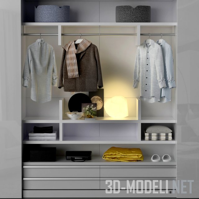 Элегантная гардеробная Novamobili Unika. Шкаф белого цвета, с открытыми полками и ящиками в нижней части. На верхней полке стоят две большие круглые серые коробки. На полках лежат различные предметы, в том числе и черная плоская сумочка, белые домашние тапочки и свернутый плед яркого желтого цвета. На рилинге висят вешалки с вещами.