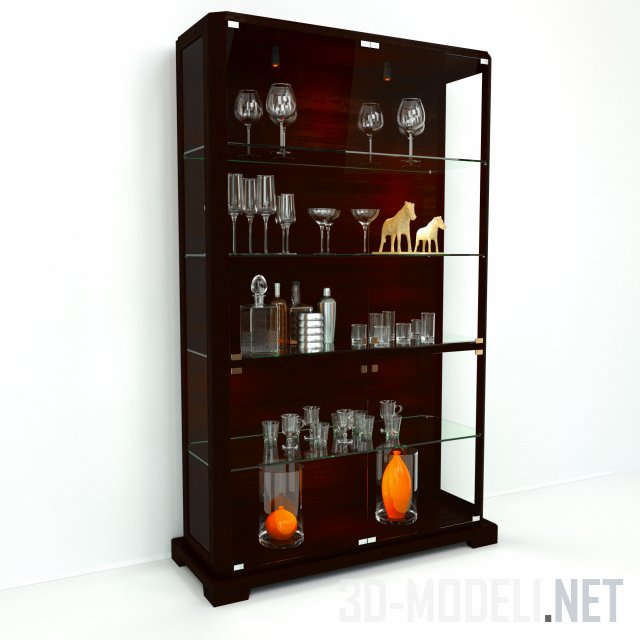 Классическая витрина DOWN TOWN 7719 от фабрики SELVA. Изготовлена из дерева темно-вишневого цвета. На стеклянных полках стоят разнообразные бокалы из прозрачного гладкого стекла, оранжевые вазы, две фигурки лошадей и флаконы. Ширина витрины 125 см, глубина 49 см, высота 201 см.