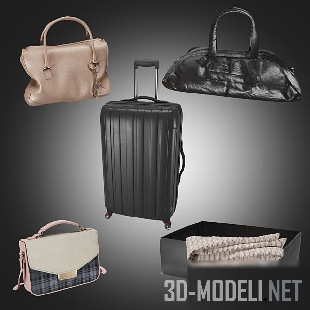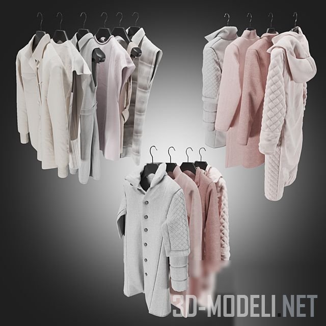 Наполнение для гардероба от производителя Flou. Многочисленные предметы женской одежды и аксессуары (пальто и платья, шарфы и сумки) висят на вешалках, сложены на полках. Рядом стоит чемодан. Гардеробная изготовлена из дерева шоколадного цвета.