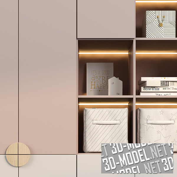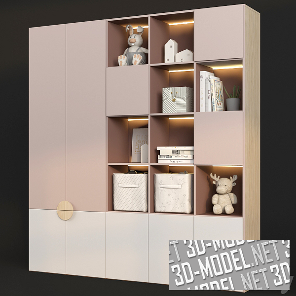 Прекрасный вариант держать порядок в детской комнате, пространстве, в котором всегда много различных вещей - удобный и вместительный шкаф. Шкаф имеет гардеробную секцию и стеллаж, а котором открытые полки чередуются с закрытыми. Это создает декоративный эффект и позволяет разместить игрушки и декор на видном месте. Размер шкафа: 2000 х 2150 х 400 мм.