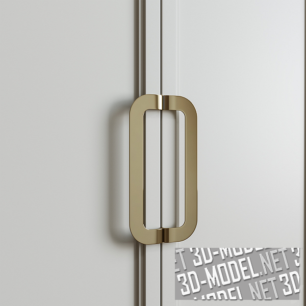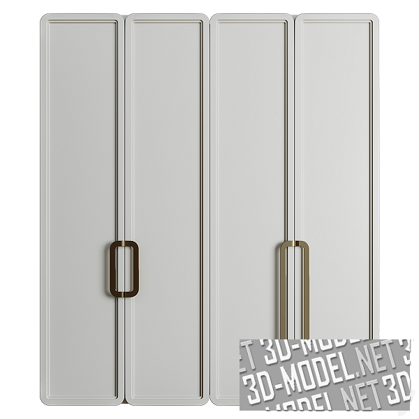 Оригинальный дизайнерский гардеробный шкаф с подсветкой. Шкаф светлый, что делает его стильным и универсальным. Две двухдверные секции с распашными дверцами имеют с-образные латунные ручки. Одна из них больше другой, что делает такую деталь интересным решением для мебели.