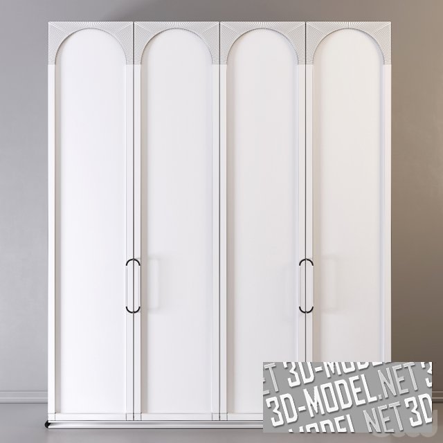 Классический шкаф для вещей. Изготовлен из натурального дерева. Белый цвет придает мебели воздушности и ощущения простора. Хотя сам гардеробный шкаф на самом деле достаточно вместительный. Его дверцы напоминают арки, что соответствует классической стилистике.