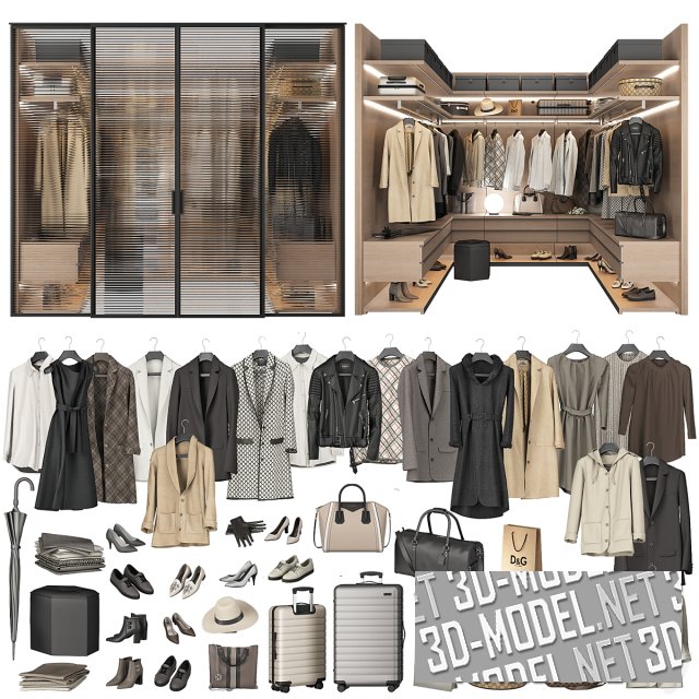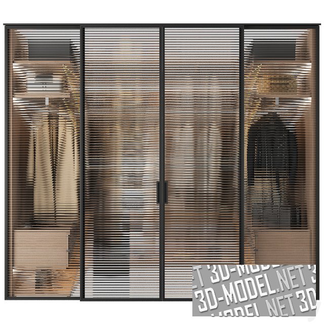 Современная гардеробная система, которая состоит из отдельных сгруппированных модулей. Раздвижные двери из стекла имеют ребристую поверхность. Сцена представляет собой гардеробную зону с наполнением в виде верхней одежды, обуви, сумок, перчаток и других аксессуаров. Размеры: 2950 мм x 2600 мм x 3000 мм.