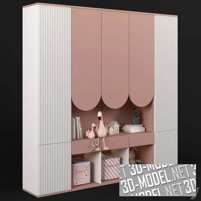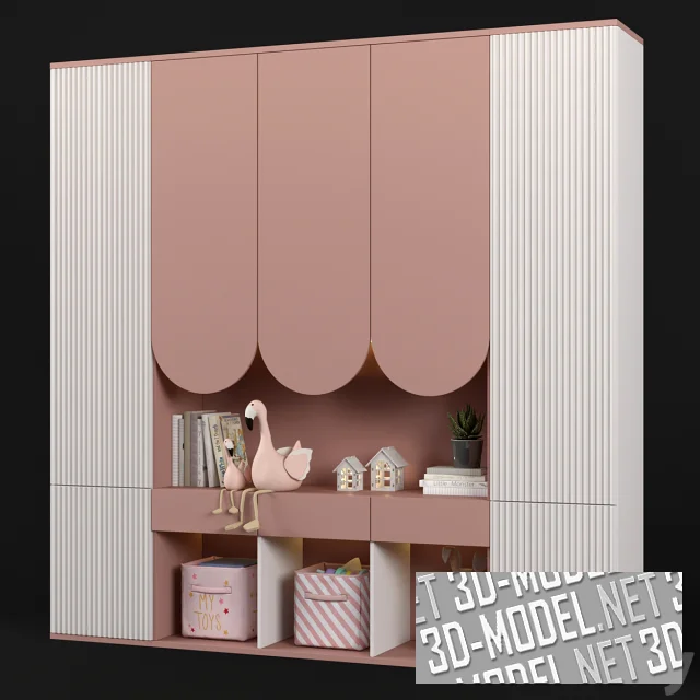 Функциональный и красивый шкаф для детской комнаты. Цветовая гамма (белый и розовый) ориентирован на девочку. Шкаф имеет обычные и оригинальной формы фасады, а также открытые секции и полку. Декоративные элементы (книги, корзины) и игрушки, среди которых выделяется фламинго, создают романтичную и живую атмосферу.