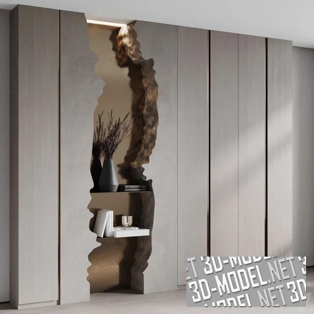 Минималистичная мебельная группа River в современном стиле. Декоративным акцентом в композиции является гипсовая конструкция (ширина 130см) с отделкой под светло-серый камень. В конструкции «вырезана» криволинейная ниша, напоминающая каньон с коричневато-золотистой задней стенкой. В нише обустроены две полки и скрытая подсветка. Слева (одна) и справа (четыре) от ниши смонтированы узкие вертикальные шкафы (шириной 40см) с глухими фасадами из светлого дерева. На полках: графитово-серая ваза с ветками Grevillea Ivanhoe, книги, подсвечник.