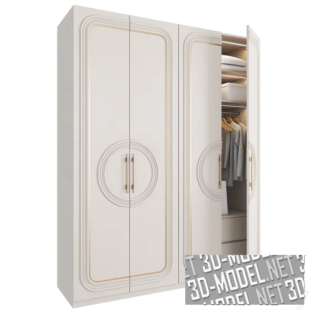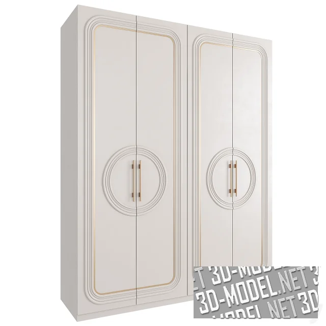 Двухсекционный четырехстворчатый белый платяной шкаф Sanmarino от Shkafulkin. Декор из фигурного рельефного молдинга образует два вертикальных прямоугольника со скругленными углами и с кругами внутри на парах створок шкафа. Внутри кругов смонтированы вертикальные золотистые ручки. Тонкая золотистая вставка на фасадах дублирует рисунок прямоугольников со скругленными углами. Шкаф наполняют полки с коробками, белыми подушками, вешалками с одеждой и выдвижными ящиками в нижней части секции.