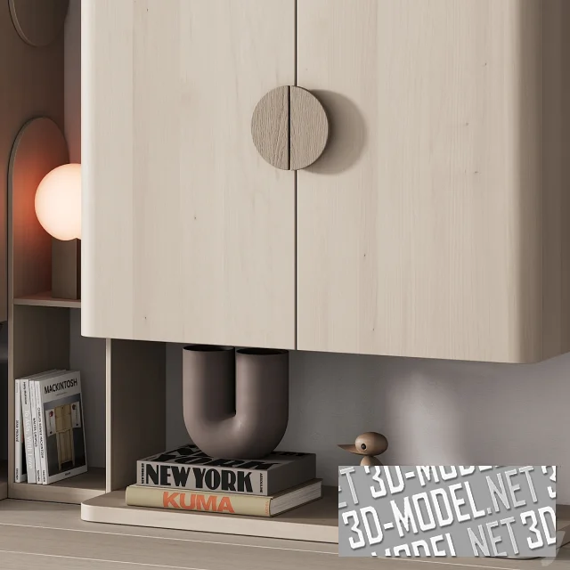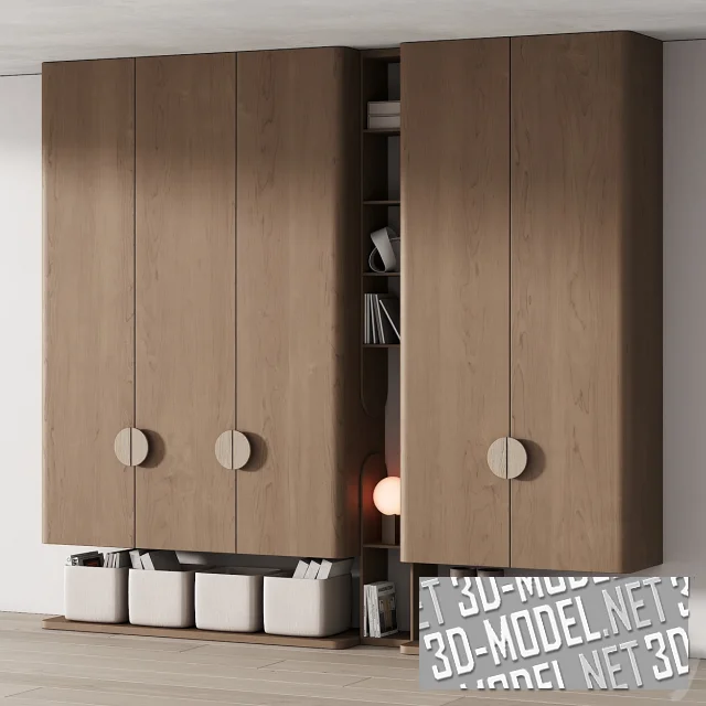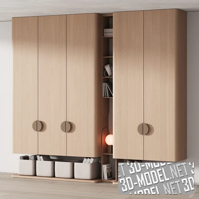 Современный шкаф со встроенным стеллажом в детскую комнату. Представлен в трех вариантах материала, с реалистичным наполнением в виде игрушек, книг и других аксессуаров. Размеры: в 300 см, ш 330 см, г 50 см. Эта универсальная мебельная конструкция гармонично дополнит интерьер в современном и скандинавском стиле, а также в стилях минимализм, джапанди, ваби саби и пр.