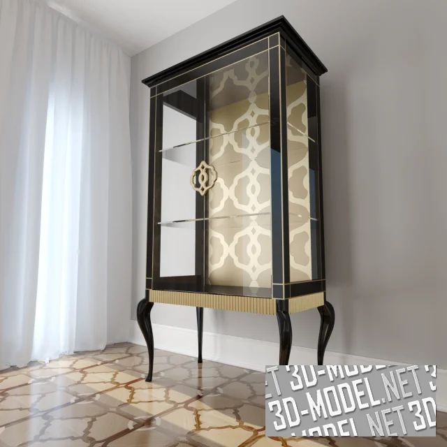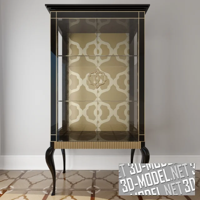 Современный витринный шкаф для гостиной в стиле арт-деко - модель Fritz от Bruno Zampa, из коллекции Avantgarde. Черный каркас корпуса с багетным венцом и тонкими золотистыми молдингами смонтирован на золотистой рельефной раме с высокими гнутыми черными ножками. Боковые стенки заполнены прозрачным стеклом. Задняя стенка декорирована паттерном золотисто-охристых тонов. Элемент паттерна продублирован в золотистых ручках на двух стеклянных прозрачных створках витрины. Пара стеклянных полок позволят разместить книги, посуду, аксессуары.