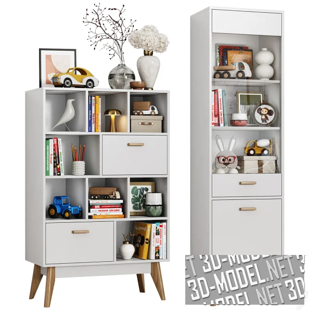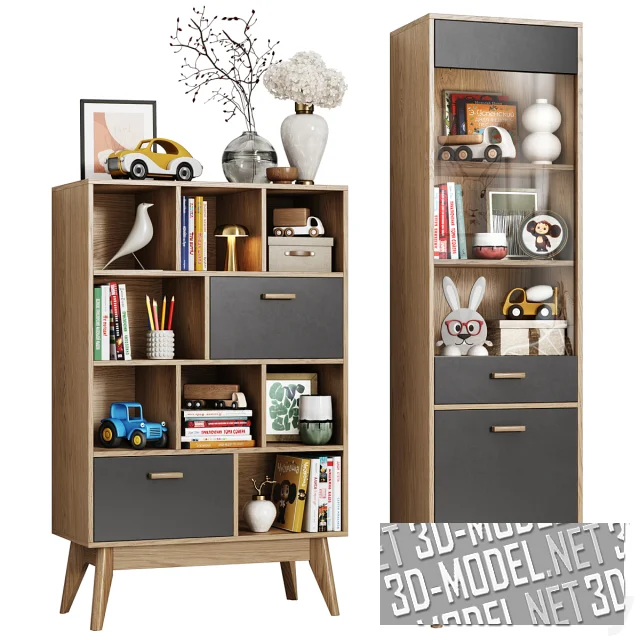 Пенал (50х40х185см) и комод (85х40х135см) Nordic Scandi (Scandica Horten) от divan.ru и hoff.ru, книги, игрушки, декор. Шкафы смонтированы на невысоких деревянных ножках с рамой из дерева. В пенале открытые полки, выдвижной ящик и секция со створкой в нижней части. В комоде ассиметричные открытые полки и две откидные створки.