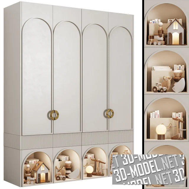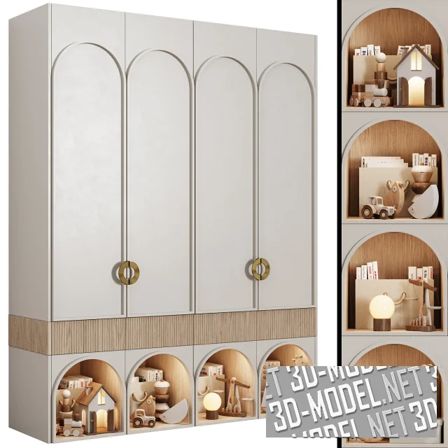 В арочных проемах коробки, книги, деревянные игрушки, карандаши, модель яхты, настольный светильник с шариком плафона. Отделка представлена в трех вариантах: белый, белый с пудровыми вставками, белый с деревянной вставкой на уровне выдвижных ящиков. Габарит шкафа: 204х61х260см.
