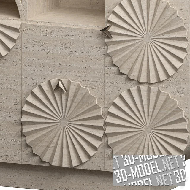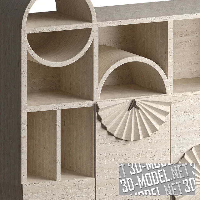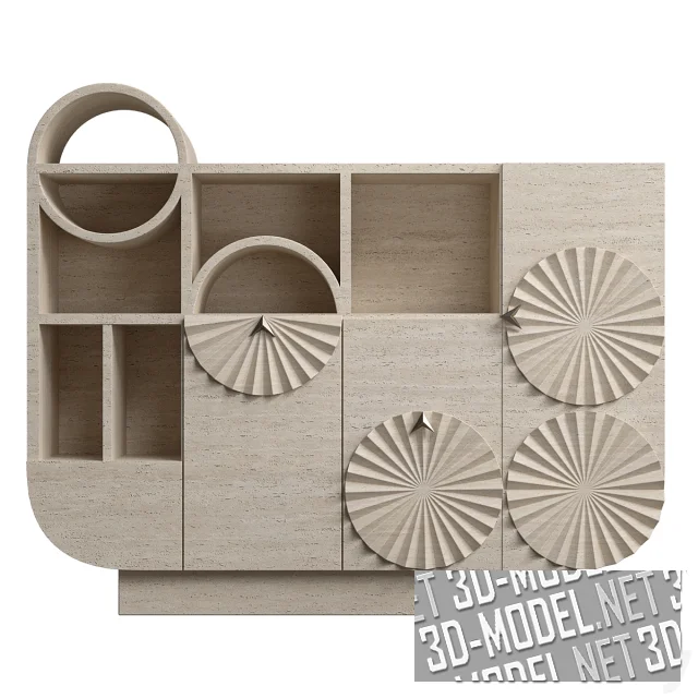 Декоративный современный шкаф из светло-песочного травертина - Sensu от Eva Szumilas (2023 года), эксклюзивно для STUDIOTWENTYSEVEN (сделано в Ливане). Изделие выполнено в виде высокой фигурной тумбы со скругленными углами внизу на прямоугольном цоколе. Объем шкафа разделен на несколько квадратных открытых и несколько закрытых ячеек. В открытые ячейки интегрированы полуцилиндры, создающие круги на фронтальной плоскости. На закрытых секциях тему кругов продолжает резьба с рельефным изображением веероподобных кругов. На створках смонтированы латунные ручки в виде стрелок. Габарит шкафа: 173х203х54см.