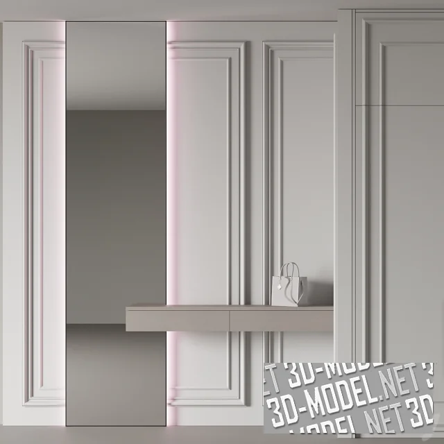 Современный гардеробный шкаф с наполнителем. Для дополнительного удобства встроена специальная полка-столик для хранения различных аксессуаров. На полке женская сумка. Вместительный шкаф позволяет максимально освободить пространство, соблюдая идеальный порядок. Подойдет для интерьера прихожей и других пространств.