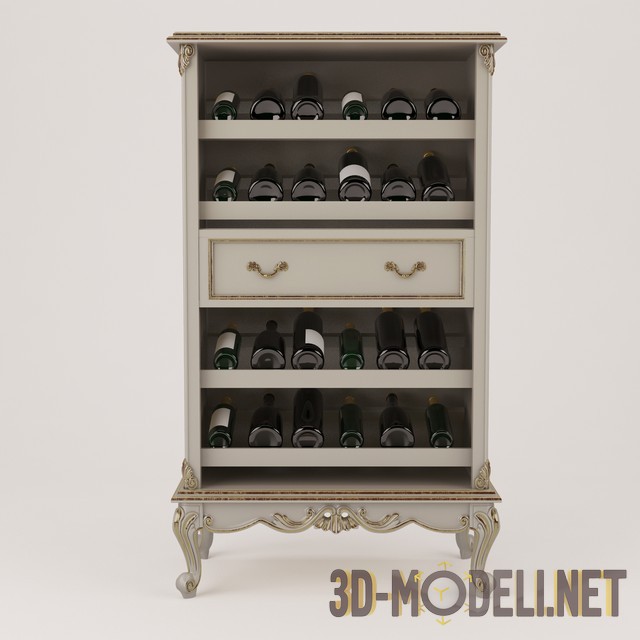 Качественно сделанная, реалистичная 3D-модель винного шкафа итальянского производства фабрики Modenese Gastone. Шкаф принадлежит изысканной коллекции Casanova, его артикул 12135. Материалом изготовления послужила натуральная древесина, окрашенная в нежный молочный цвет. Золотистые вставки, резьба ручной работы, общий классический дизайн позволяют смело использовать шкаф в любом элегантном интерьере. Модель имеет пять различных отделений, одно закрытое. Габариты шкафа: 87 x 48 x 149 см.