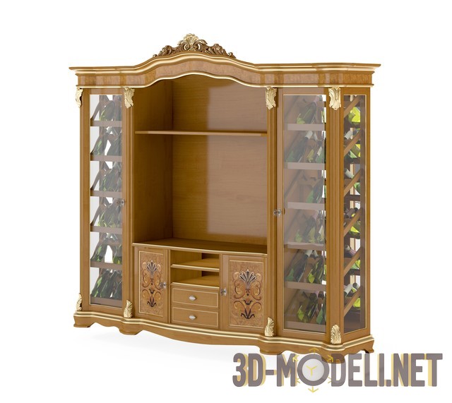 3d-модель деревянного серванта от Modenese Gastone, 13134 Bella Vita. Выполнен в стиле барокко, в нижней част оснащен дверями, расписанными цветочным узором. Дополнен открытыми полками посередине и двумя открытыми винными секциями справа и слева. Шкаф украшает фигурный венец и золотая инкрустация по фасаду. Модель станет хорошим вариантом для классического интерьера.