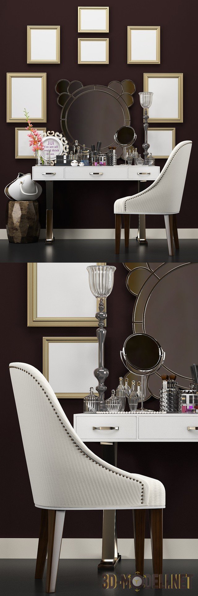 Изящный туалетный стол с полноценным наполнением: в комплекте фигурной формы зеркало, кресло, цветы, косметика, сумка и множество других элементов, делающих столик невероятно женственным и реалистичным.