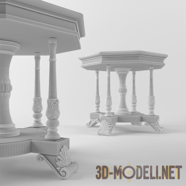 Классический столик из ценных пород дерева, с декором в стиле ампир. Восьмиугольная толстая столешница обрамлена багетом. Ножек пять. Центральная, толстая, выполнена в виде точёной колонны, и украшена золотистым рельефным элементом. Ещё четыре ноги располагаются по краям лучей крестовины основания. Они более тонкие, с растительными элементами золотистого цвета. Под крестовиной ножки, в виде декоративных завитков, тоже золотистые.