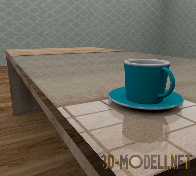 Современный журнальный стол из клеенного массива дуба, в стиле лофт, с интегрированной в деревянную столешницу толстой, стеклянной, прозрачной плитой. Поверхность древесины вскрыта матовым лаком, что только подчёркивает натуральность материала. Исполнение стола очень лаконично. Он состоит из трёх толстых прямоугольных плит, одна из которых – столешница, а две – вертикальные стойки ног. В уголке столешницы приютилась бирюзовая чашка с блюдцем. Размеры стола: 150 x 70 х 49 см, размер стекла 100 x 70 см