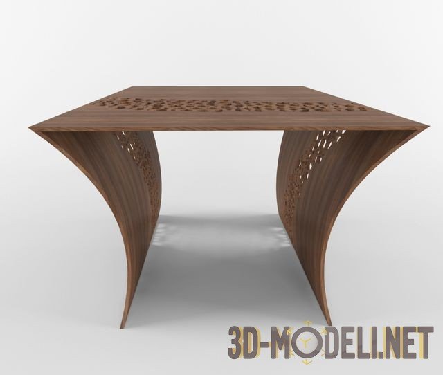 Современный изящный кофейный столик из тонированного дерева с перфорацией. Столик изготовлен из трёх плоскостей: к прямоугольной столешнице примыкают две вертикальные, плавно–изогнутые внутрь плоскости, образующие ноги стола. По всем трём плоскостям перфорированной полосой проходит декор. Сквозная перфорация сделана в дереве в виде множества многоугольников, разделённых перемычками. Размеры: 100 х 60 х 40