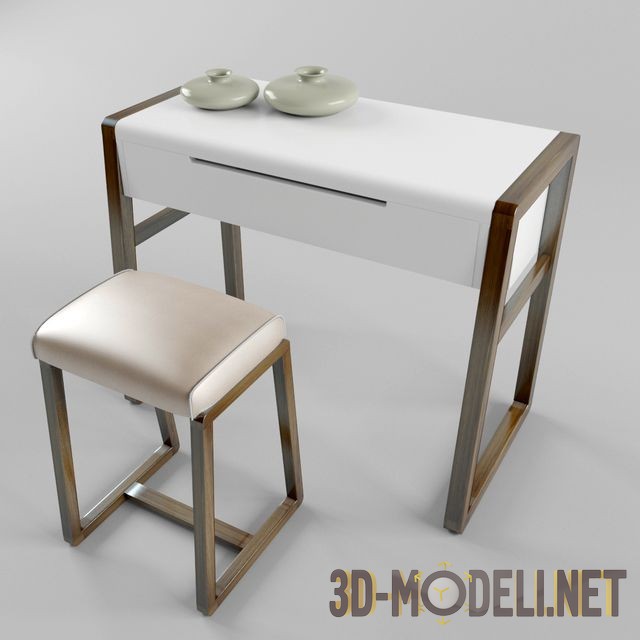 Небольшой прямоугольный туалетный столик с пуфиком-табуретом. Ножки стола и база табурета изготовлены из деревянного бруса и тонированы лаком. Мягкое сиденье табурета обтянуто светло–бежевой кожей. Корпус стола представляет белый короб со сглаженными гранями. Под столешницей размещён выдвижной ящик с прорезью ручки. На столе пара низких керамических ваз.