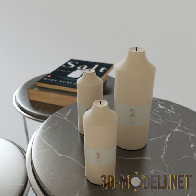 Группа разновысоких кофейных столиков. Круглые столешницы сделаны из чёрного с белыми прожилками мрамора. Столешницы монтируются в основание, сваренное из квадратного металлического профиля серебристого цвета. Каркасы сварены из нижнего и верхнего горизонтальных колец с четырьмя вертикальными перемычками. На столиках разместились три большие свечи и пара книг.