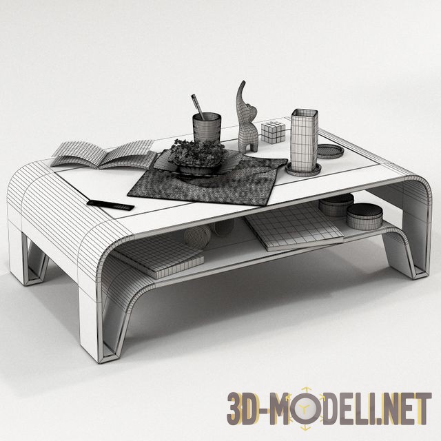 Актуальный предмет мебели для любого современного пространства: кофейный столик. Создан из склеенных между собой деревянных ламелей, создающих декоративный эффект, схожий с уложенным паркетом. В верхнюю плоскость интегрировано стекло. Столешница плавно изгибается вниз, образуя ножки. Они, в свою очередь, переходят в нижнюю полку. На верхней и нижней плоскостях разложены книги, журналы, коробки, стакан с карандашом, фигурка слоника, свеча и тарелка с растущим клевером. Размеры стола: 60 х 100 х 30 см.